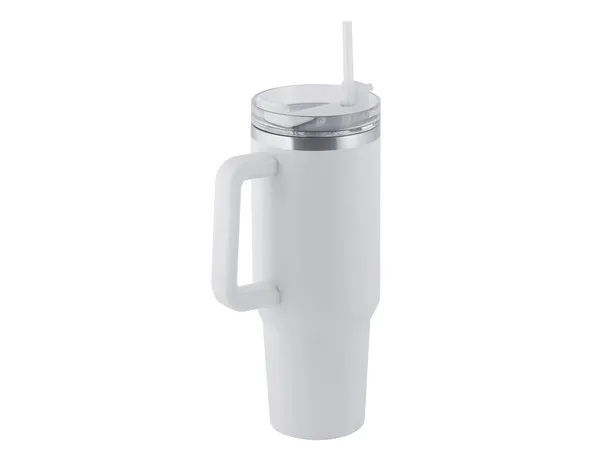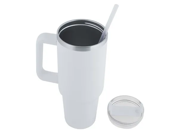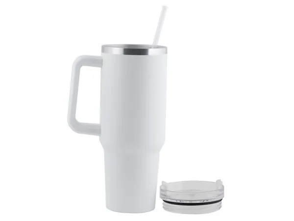 Stay hydrated all-day while on the go with the Hardy Travel Tumbler, featuring a sturdy handle and a secure, 3 position rotating lid with an opening for the re-usable straw, a wide mouth for drinking, and dust-proof cover to prevent dust from spoiling your drink. Its large size makes it suitable for high-intensity workouts and extra-long commutes, yet still fits comfortably in your car cup holder. Its stainless steel double-wall insulation ensures your beverages stay hot or cold for long periods of time