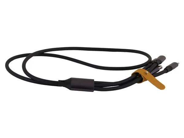 1.2 Meter 3-in-1 USB Type-C Cable for Android devices, where the orange coloured connector features data transfer and has fast charge capabilities (wall charger not included). Silicone coated, tangle-resistant and flexible wire, smooth to the touch. Aluminium alloy casing and inner copper wiring for safe charging. Reusable strap for cable management.