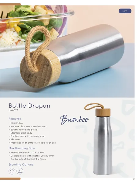 Stay hydrated in style with our 600ml Bottle Dropun. Featuring a stainless steel body and bamboo cap, this eco-friendly bottle is perfect for on-the-go use.