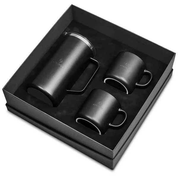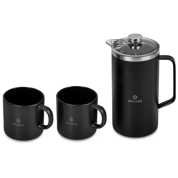Keep hot coffee at hand for yourself and others with this large-capacity French Press. The stainless steel vacuum construction will keep the coffee hot for hours, and the stainless steel mesh filter keeps the coffee grounds in place. The plunger is combined with two ceramic coffee mugs in an elegant black gift box.