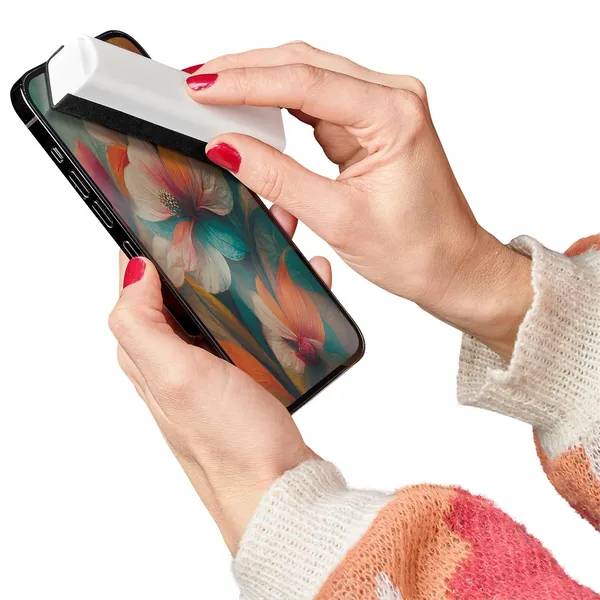 Keep your phone clean and hygienic with this handy 3-in-1 sanitising spray and wipe tool. Slide the sprayer out of the cover to spray your screen, and wipe it clean with the built-in cloth section. The cover is designed to be used as a phone stand.