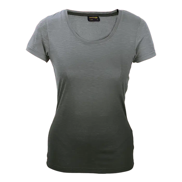 Elevate your casual style with the Bailey Crew Neck T-Shirt for Ladies. Featuring a trendy faded print on the front and contrast back neck binding, this shirt is perfect for everyday wear. Made from slub fabric, it offers both comfort and style in a variety of color options.
