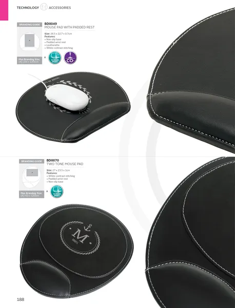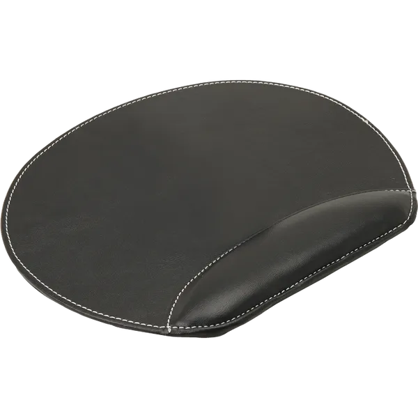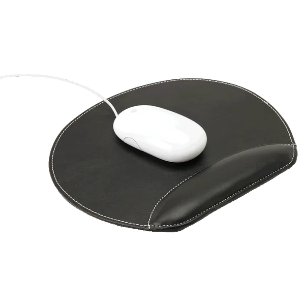 Enhance your workspace with the Barron Mouse Pad featuring a padded wrist rest for ultimate comfort. Non-slip base and stylish leatherette design with white contrast stitching.
