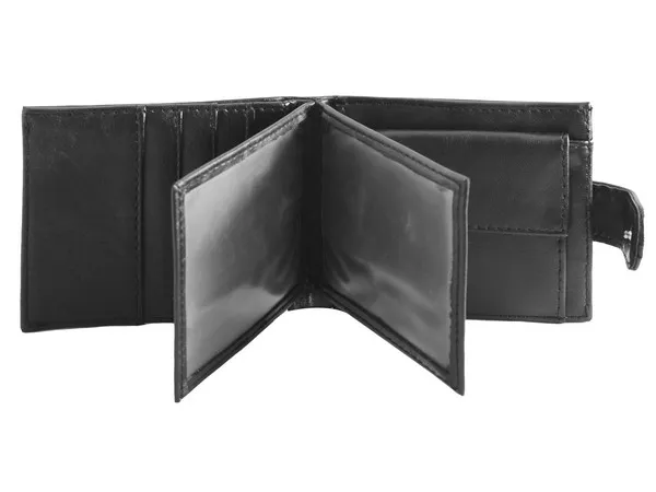 Luxurious feel with bold branding. Includes compartments for holding cards, 2 window compartments, 1 cash compartment, 1 inner zip compartment and 1 coin stud compartment