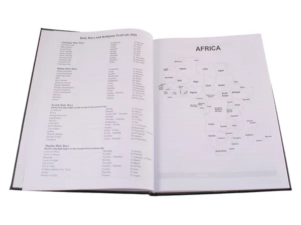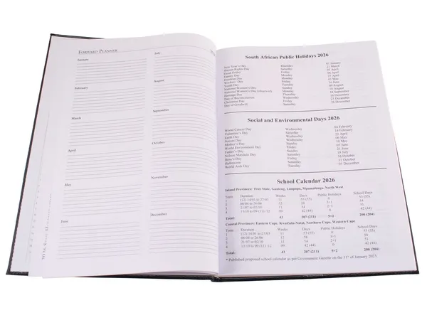 Daily Inspirational Quotes. Page-A-Day. With Satin Bookmark.Inner pages Include: Public Holidays, Social and Environmental Days, Holy Days & Religious Festivals, School Calendar, Africa Map, Emergency Numbers, International Dialling Codes, Web Directory, SA National Symbols, Gautrain Timetable