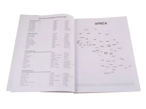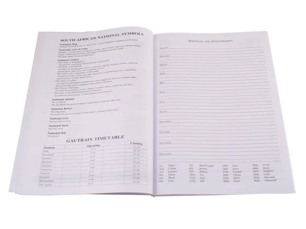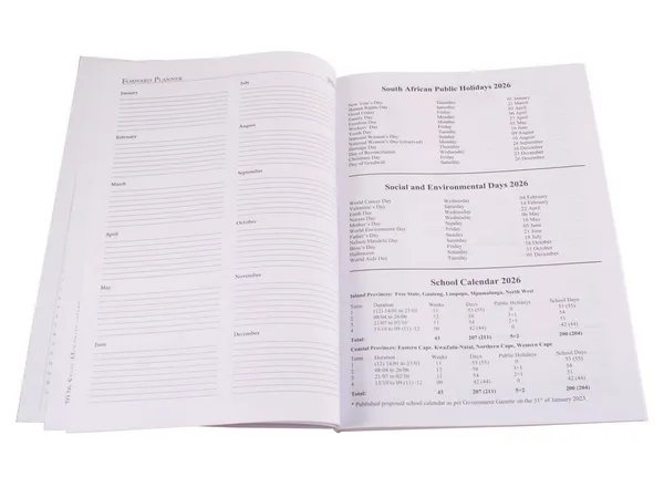 Daily Inspirational Quotes. Page-A-Day. With Satin Bookmark. Inner pages Include: Public Holidays, Social and Environmental Days, Holy Days & Religious Festivals, School Calendar, Africa Map, Emergency Numbers, International Dialling Codes, Web Directory, SA National Symbols, Gautrain Timetable