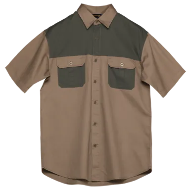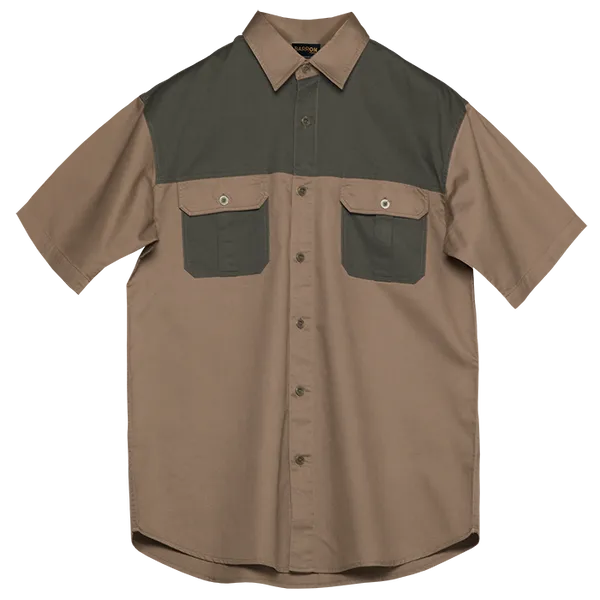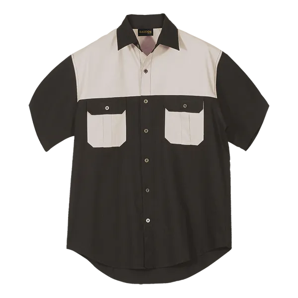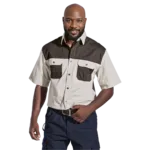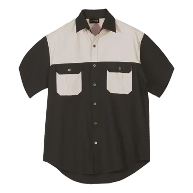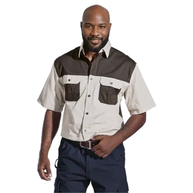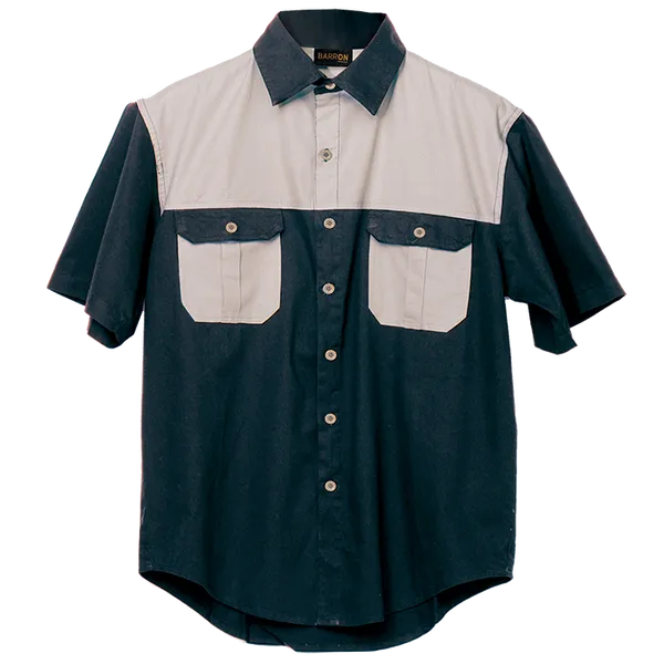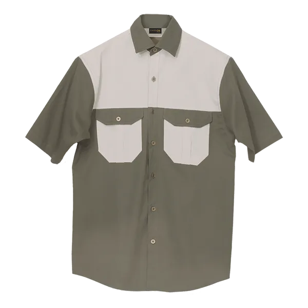 Introducing the Two Tone Bush Shirt by Barron – a classic South African favourite made from durable cotton twill fabric. Features include pleated pockets, double-needle stitching, and a stylish two-tone design. Perfect for any outdoor adventure!